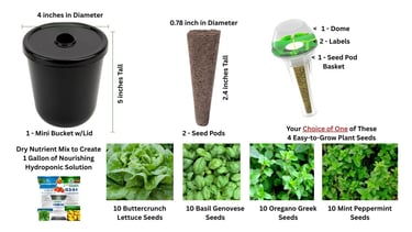 Each kit includes everything you need to get started: a mini bucket with lid, 2 seed pods/sponges, a pod basket, 2 labels for easy plant tracking, a planting dome for optimal germination, and your choice of 10 Buttercrunch Lettuce, 10 Basil Genovese Herb, 10 Oregano Greek Herb, or 10 Mint Peppermint Herb seeds. You’ll also receive a dry nutrient mix to create 1 gallon of nourishing hydroponic solution, giving your plants the essential minerals they need to grow strong and healthy.